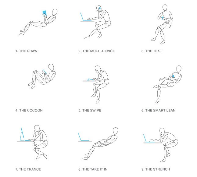 随着笔记本电脑和智能手机的出现,我们的日常工作和坐姿已经出现了新的重复性劳损(RSI),比如黑莓拇指。Steelcase在全球11个国家开展了一项研究,观察了2000多人在不同环境和姿势下的表现。该公司的研究人员发现了9种新的坐姿……